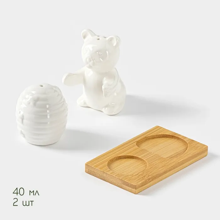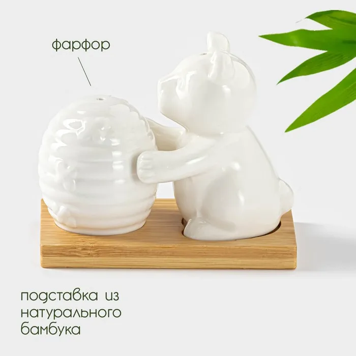 Набор для специй BellaTenero «Мишка с ульем», солонка 40 мл, перечница, 40 мл, на бамбуковой подставке, фарфор, белый — Характеристики