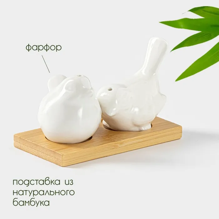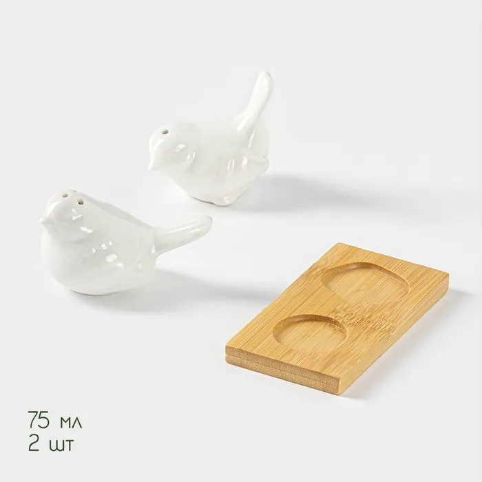 Набор для специй BellaTenero «Воробушки», солонка 75 мл, перечница 75 мл, на бамбуковой подставке, фарфор, белый — Характеристики