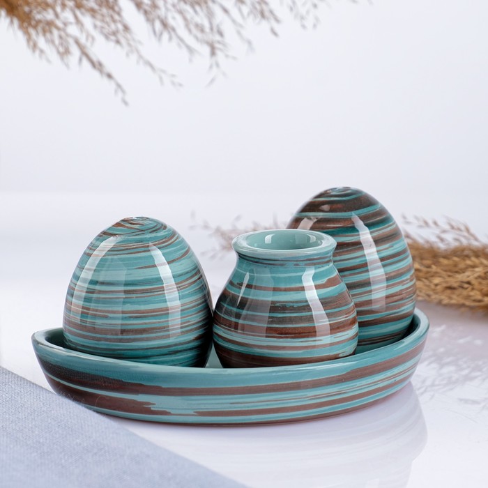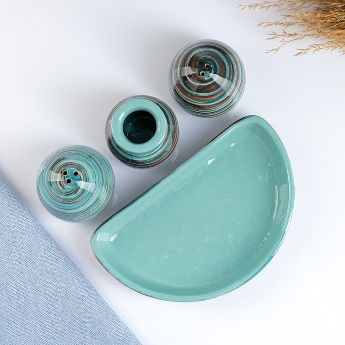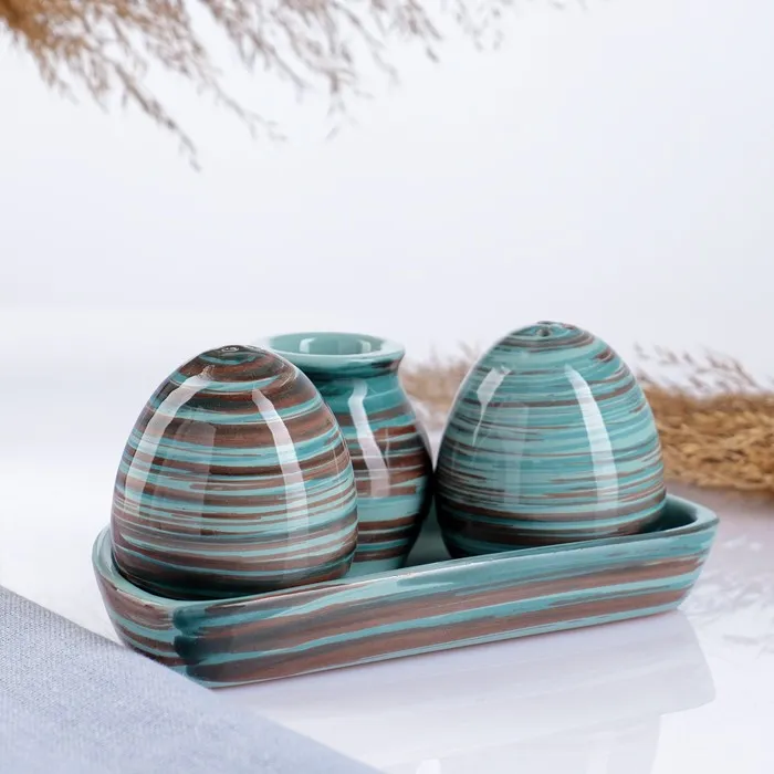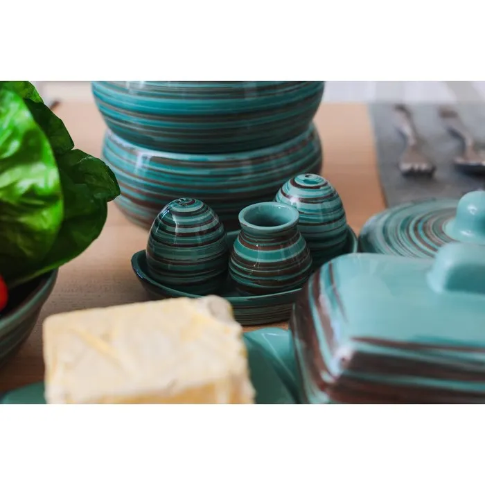 Этот набор керамических ёмкостей для специй сочетает скандинавскую лаконичность с практичной организацией пространства. Четыре овальных баночки в бирюзовом цвете с графичным полосатым рисунком создают стильный акцент на кухонной полке. Ручная роспись кобальтом подчеркивает глубину оттенка и создаёт эффект ручной работы.
