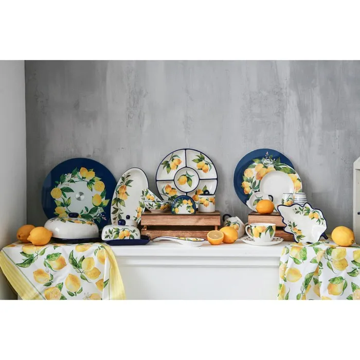 Посуда серии «Лимоны» от торговой марки Доляна изготовлена из качественного доломита. Благодаря оригинальному дизайну, изделия гармонично дополнят сервировку стола, а также прекрасно подойдут в качестве подарка. Посуда выполнена в ярких тонах, что позволит вписать её практически в любой интерьер.