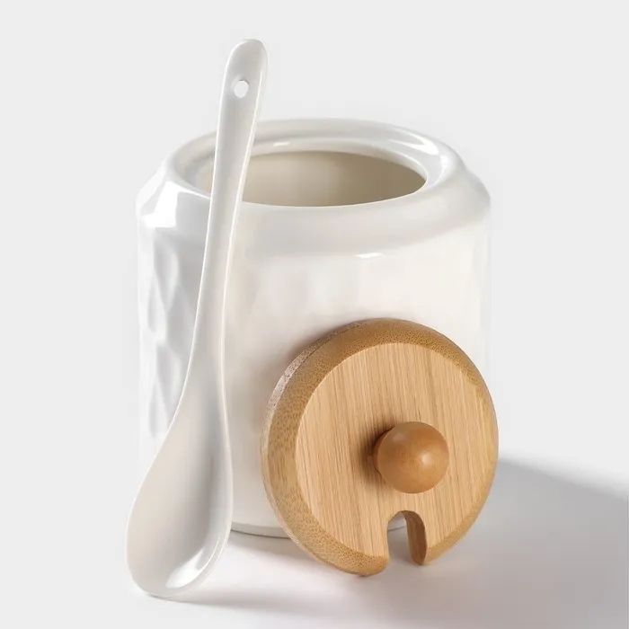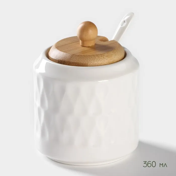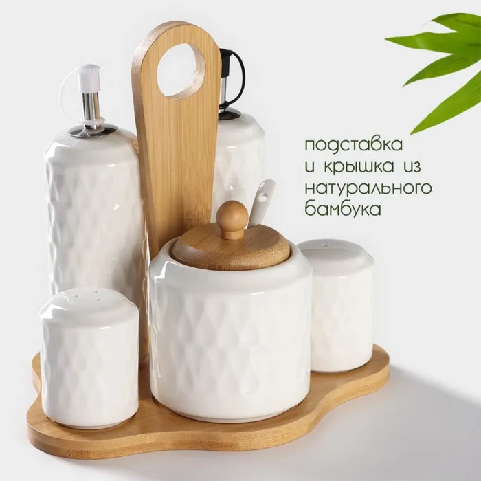 Набор для специй и соусов BellaTenero, 5 предметов: 2 соусника 200 мл, сахарница 360 мл, солонка 120 мл, перечница 120 мл, на бамбуковой подставке, керамика, белый — Характеристики