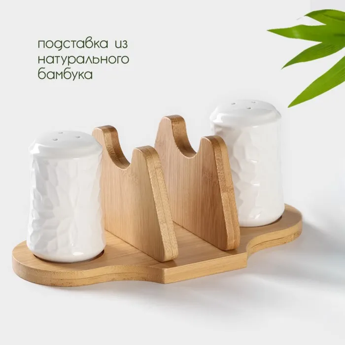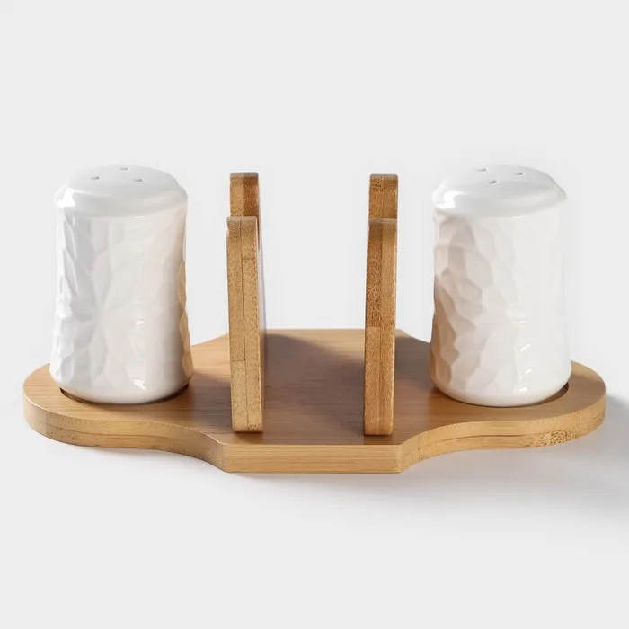 Набор для специй на бамбуковой подставке BellaTenero, 3 предмета: солонка 100 мл, перечница 100 мл, салфетница, фарфор, белый — Характеристики