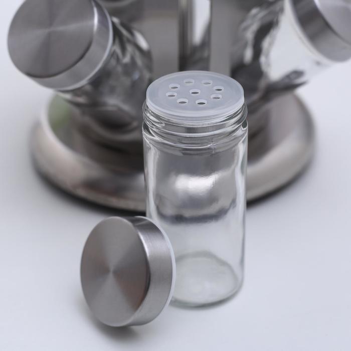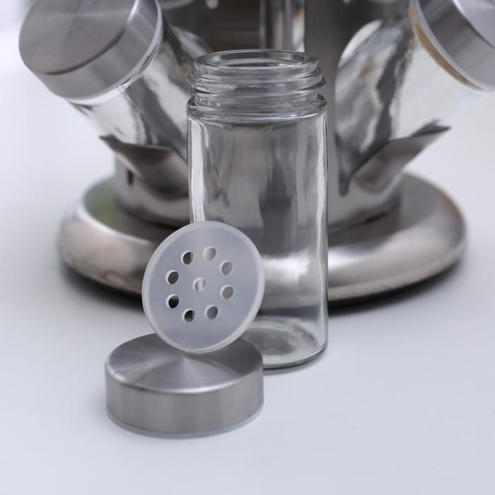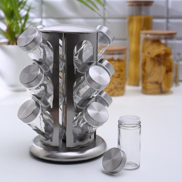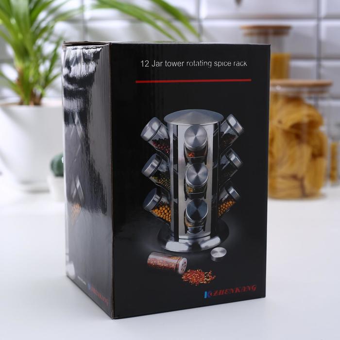 Набор для специй состоит из 12 стеклянных баночек и вращающейся подставки. Такой набор идеально подойдёт для кухни любого стиля. Ёмкости для специй имеют надежно завинчивающиеся крышки, что обеспечивает лучшее хранение специй, аромат не выветрится, а сами сыпучие продукты не просыпятся. Специальная вращающаяся на 360 градусов подставка делает хранение баночек еще более удобным. Такая подставка для 12 баночек будет полезна любой хозяйке, поможет организовать удобное для регулярного использования хранение сухих приправ, сэкономит место на кухонной поверхности, а также добавит эстетики в окружающее пространство.