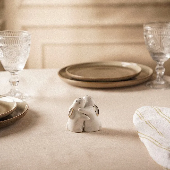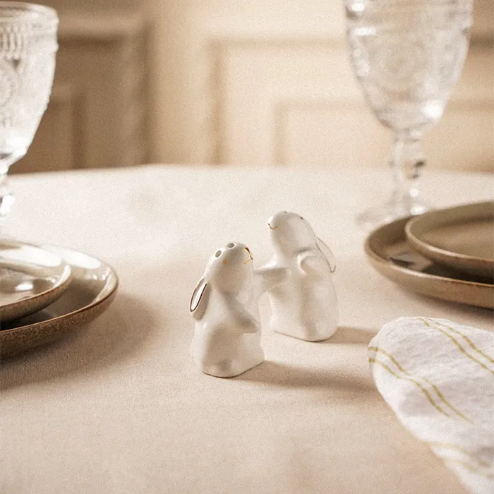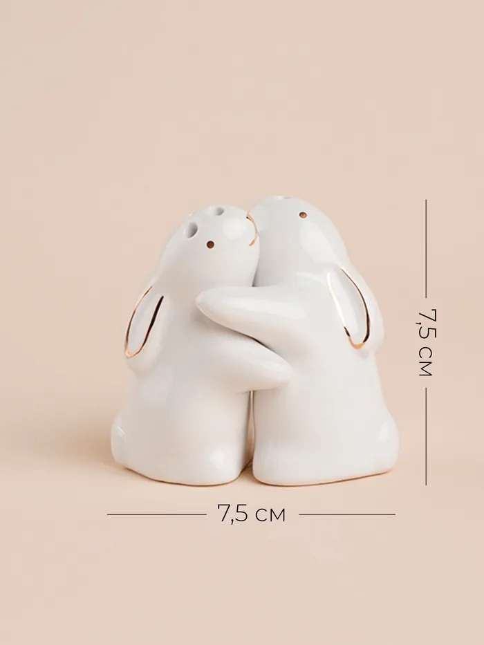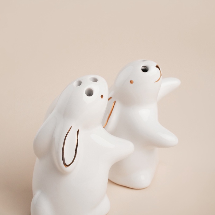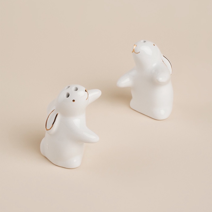 Набор включает в себя две емкости — солонку и перечницу объемом по 230 мл каждая. Белоснежный цвет и фигурная форма кроликов придают изделиям легкость и игривость, делая их идеальными для весеннего или праздничного стола.