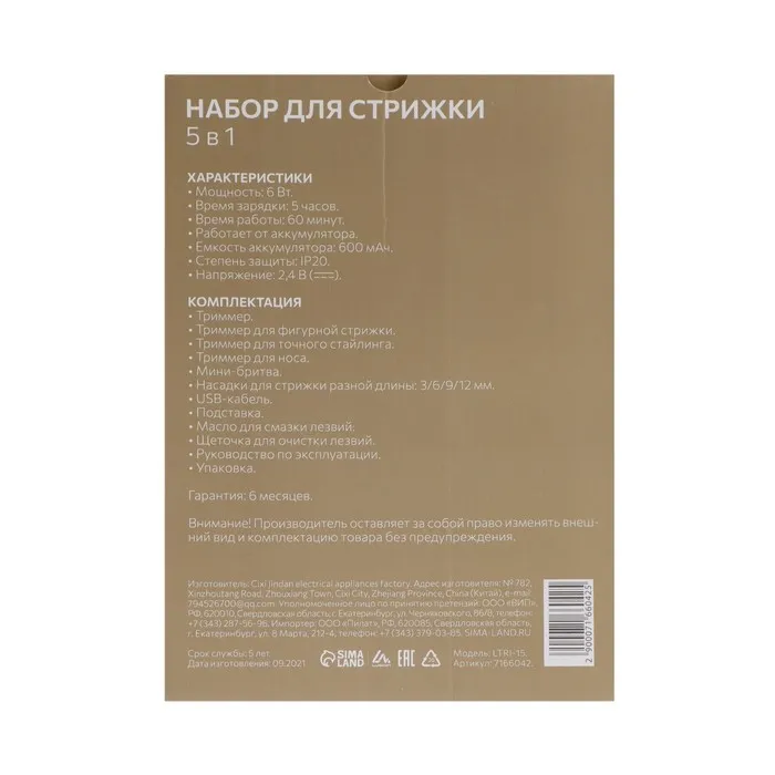 Набор для стрижки Luazon LTRI-15, 5 в 1, 6 Вт, 3/6/9/12 мм, триммер, АКБ, чёрный — Характеристики