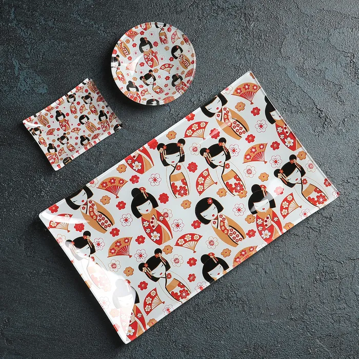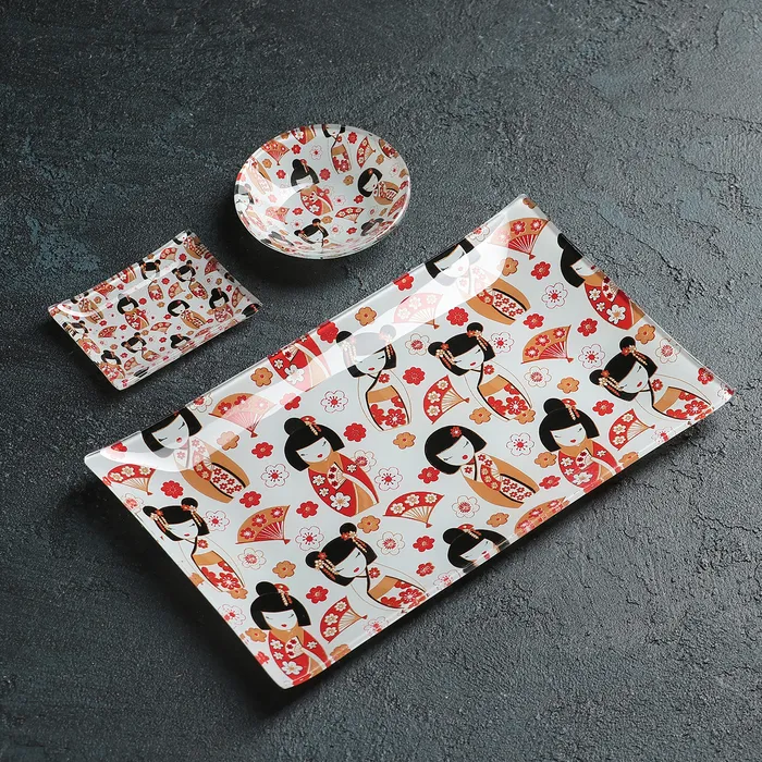 Набор для суши из стекла Доляна «Саката», 3 предмета: соусники 8×2 см, 8×6 см, подставка 25×15×2 см — Характеристики