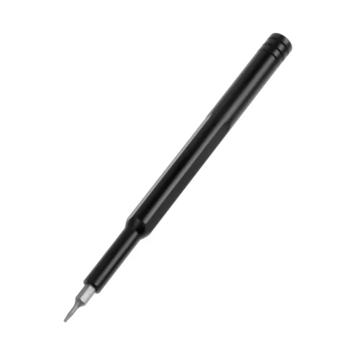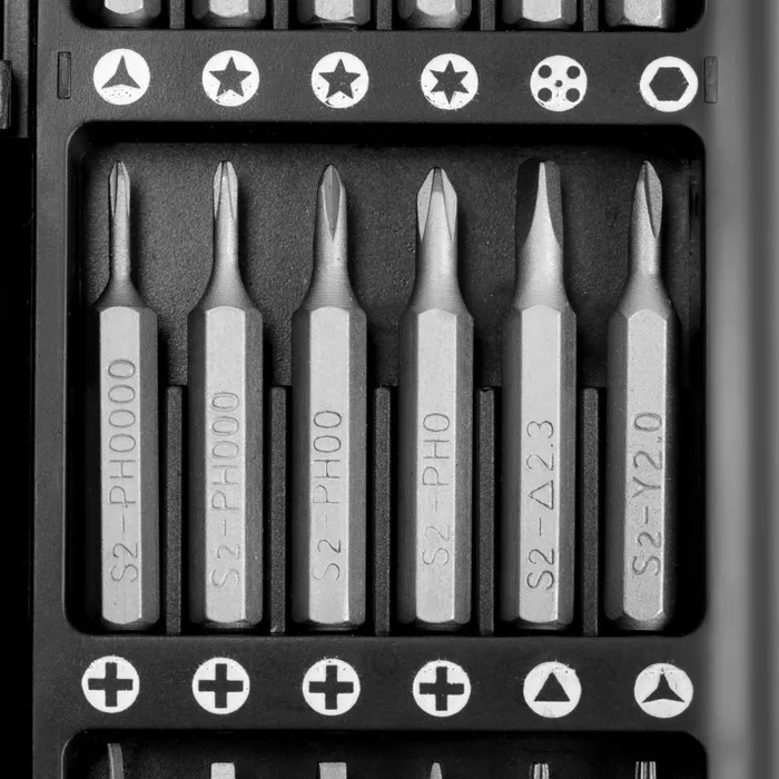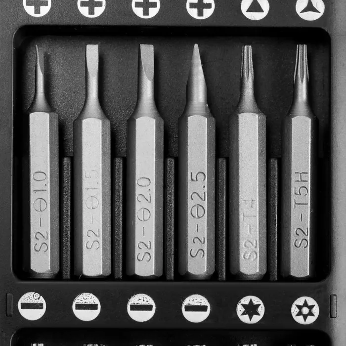 Набор бит с металлическим держаталем предназначен для точных работ. Подходит для креплений в iPhone. Биты изготовлены из высокопрочной стали S2, твёрдостью 58–62 HRC. Благодаря намагниченному ложементу биты всегда уверенно держатся в нём и в держателе-отвёртке.