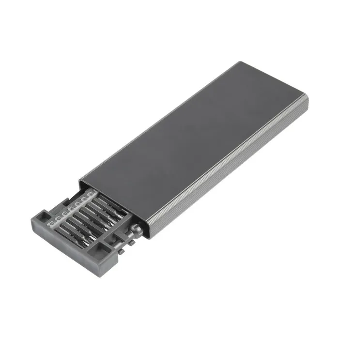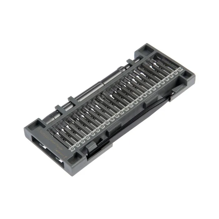 Набор хранится в металлическом кейсе с пружинным механизмом фиксации и изъятия. Намагниченный ложемент надёжно фиксирует биты.