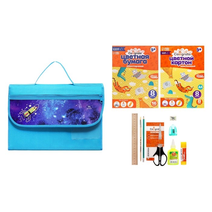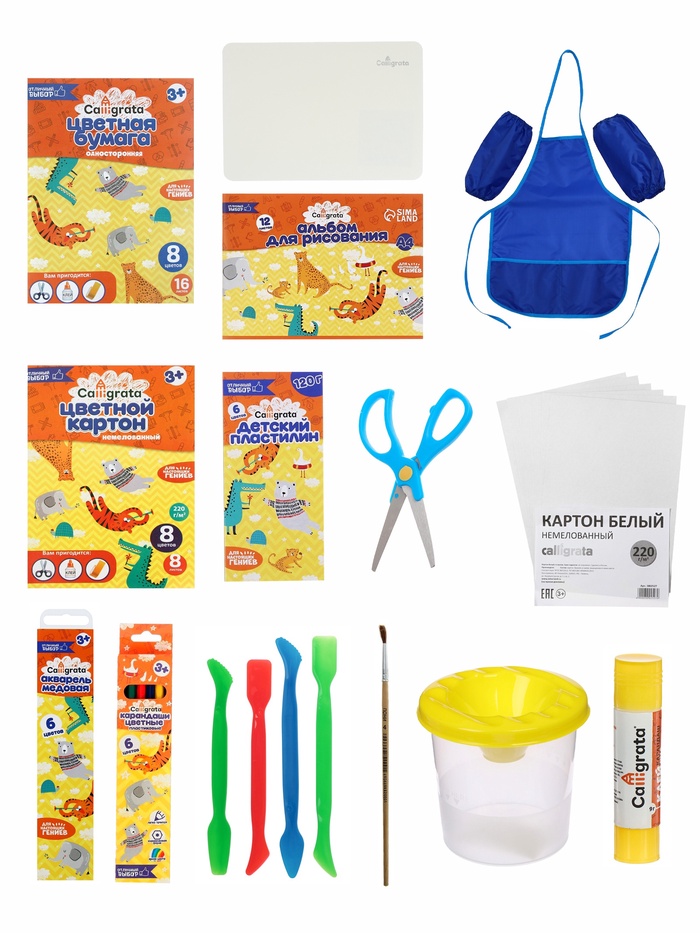 Папка для труда А4, текстильная, 350 х 270 ммБумага цветная А4, 16 листов, 8 цветовКартон цветной А4, 8 листов, 8 цветовКартон белый А4, 6 листовАльбом для рисования А4, 12 листовДоска для лепки пластик А5Стеки для лепки набор - 4 штукиАкварель 6 цветовКисть пони круглая № 4Пластилин 6 цветов 120гНожницы 13 см- Клей-карандаш 9 грамм