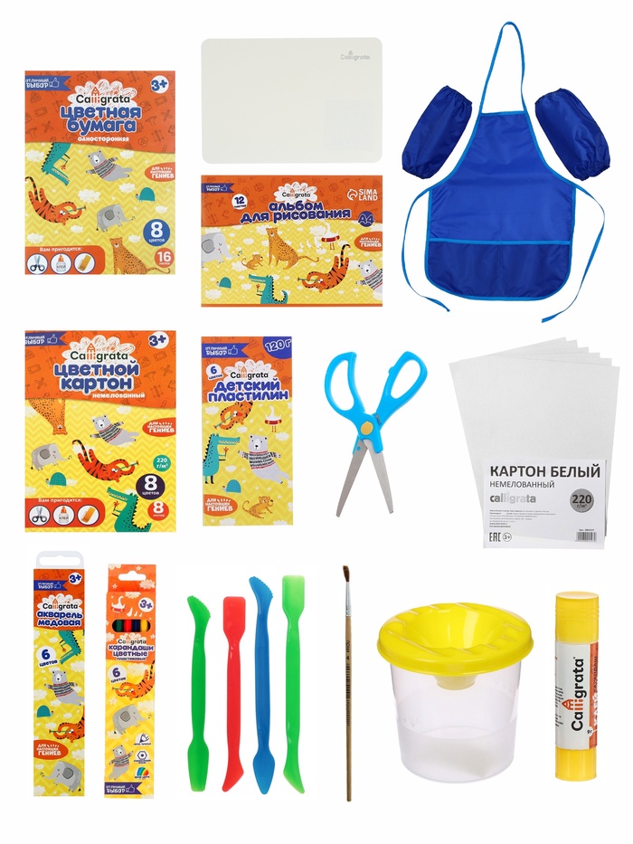 Папка для труда А4, текстильная, 330 х 260 ммБумага цветная А4, 16 листов, 8 цветовКартон цветной А4, 8 листов, 8 цветовКартон белый А4, 6 листовАльбом для рисования А4, 12 листовДоска для лепки пластик А5Стеки для лепки набор - 4 штукиАкварель 6 цветовКисть пони круглая № 4Пластилин 6 цветов 120гНожницы 13 см- Клей-карандаш 9 грамм