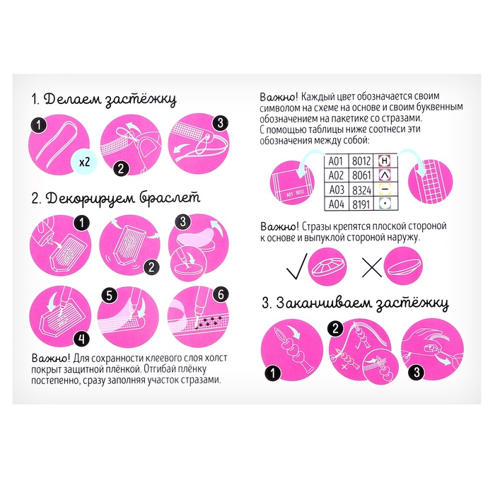 - Важно: для сохранности клеевого слоя холст покрыт защитной плёнкой, отгибайте плёнку постепенно, сразу заполняя участок стразами.