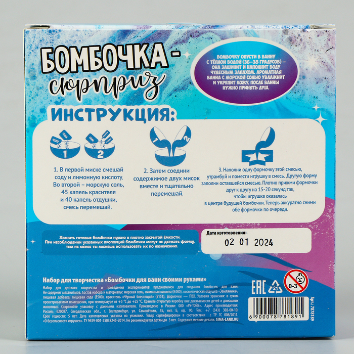 Набор для творчества позволит создать ароматную бомбочку для ванн с сюрпризом. Все необходимые компоненты уже есть в комплекте.