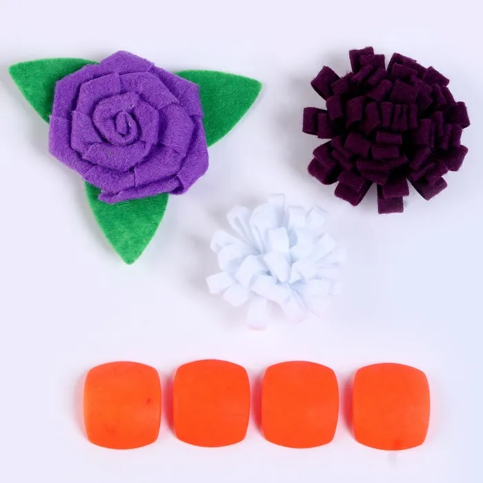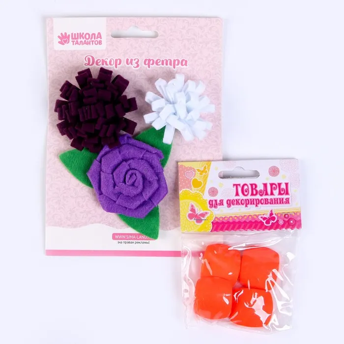Набор из фетровых цветов с пластиковыми бусинами — это фигурный декор, который можно применить в различных сферах творчества.