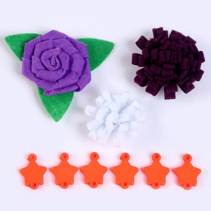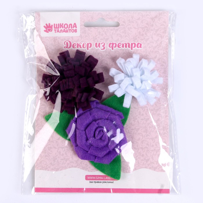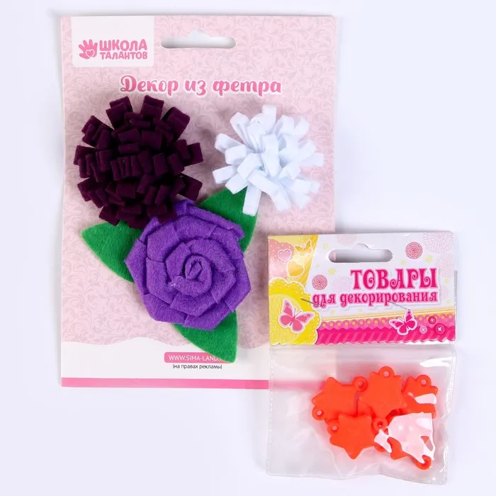 Набор из фетровых цветов с пластиковыми бусинами — это фигурный декор, который можно применить в различных сферах творчества.