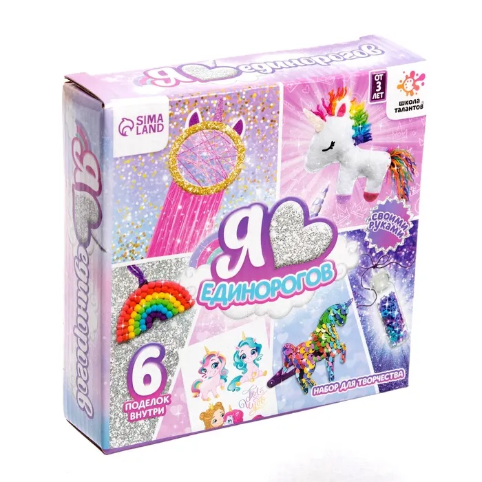 Все наборы из серии «Я люблю» представляют собой мегакомплекты с 6 поделками внутри. Состав набора разработан исходя из предпочтений ребёнка. В серии есть 4 темы: единороги, ламочки, русалки и феечки.