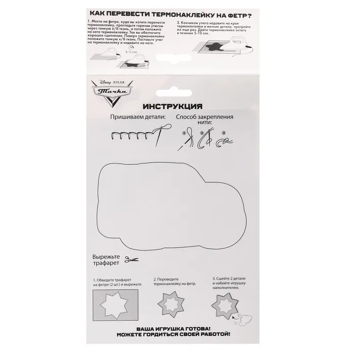 Подготовьте инструменты и рабочее место. Обведите трафарет на фетре и вырежьте две детали. Переведите термонаклейку на фетр (в этом вам поможет подробная инструкция), сшейте и набейте игрушку наполнителем.