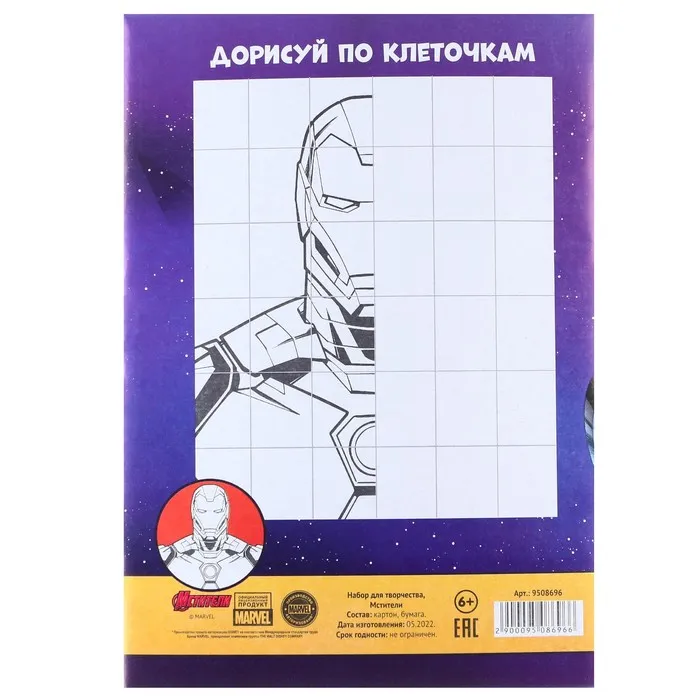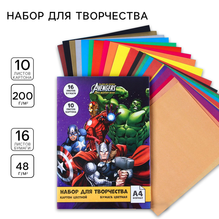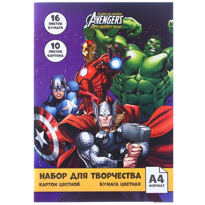 Набор для творчества «Команда» А4, цветная бумага двусторонняя 16 листов, цветной картон односторонний 10 листов, «Мстители» — Характеристики