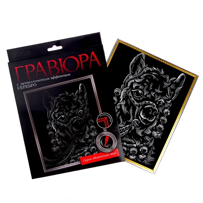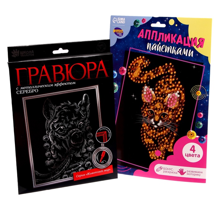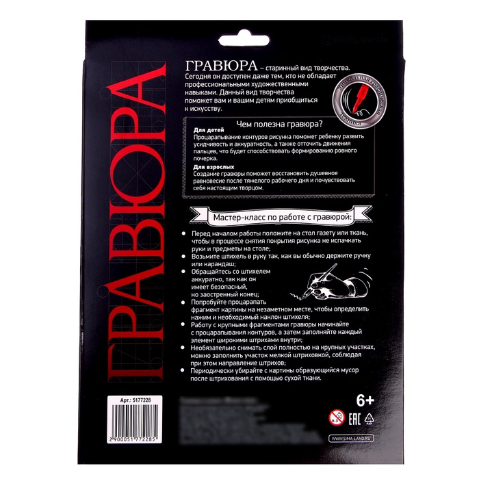 Набор для творчества поможет приобщиться к старинному виду творчества — гравюре, а также сделать аппликацию пайетками. За занятием дети разовьют усидчивость и аккуратность, отточат движения пальцев и подготовят руку к письму. А для взрослых такое творчество поможет восстановить душевное равновесие после тяжёлого рабочего дня и почувствовать себя настоящим художником .