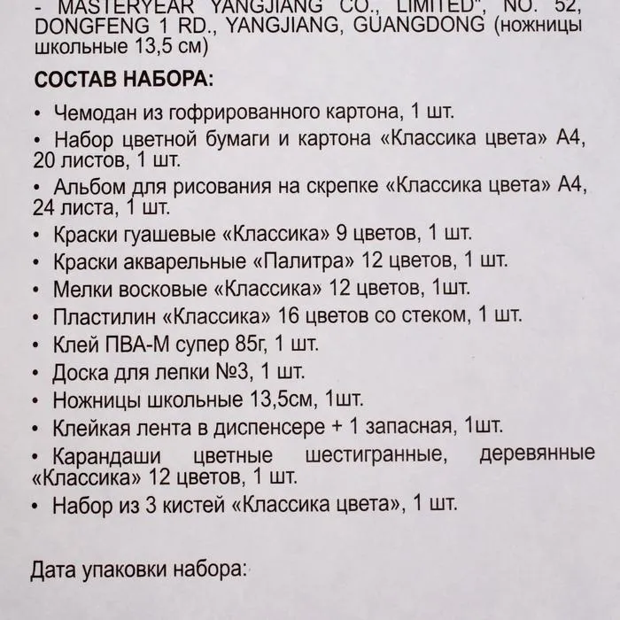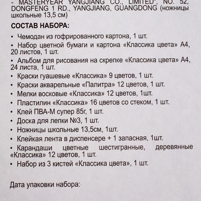 Набор состоит из различных канцелярских товаров, которые упакованы в удобный красочный картонный чемодан с пластиковой ручкой. В наборе покупатели найдут самые необходимые материалы для творчества, которые включены в обязательный список покупок к школе.