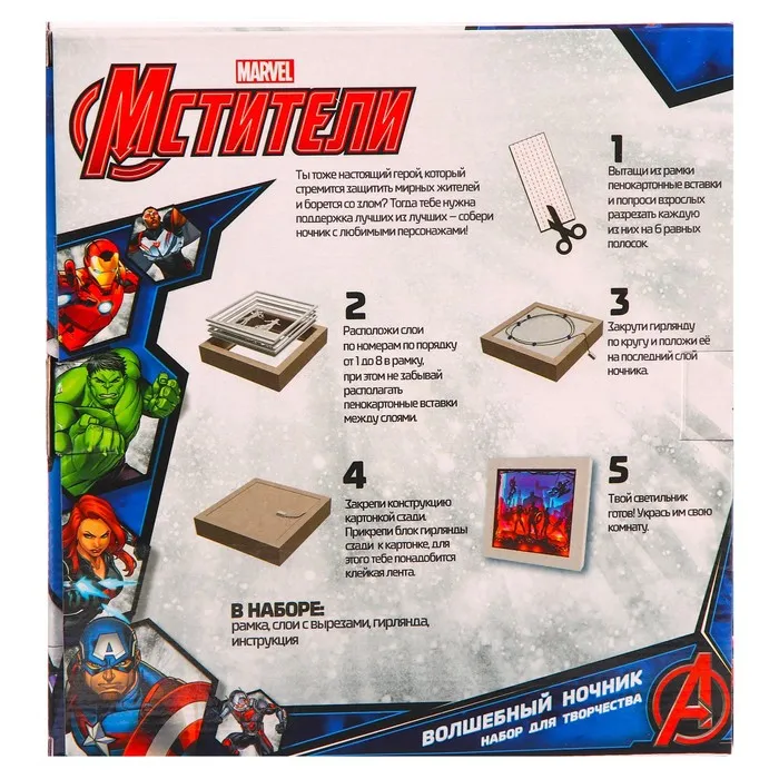 Вытащите из рамки защитные вставки и установите по бокам рамки держатели из пенокартона. Положите первый картонный слой. Приклейте скотчем 4 длинные пенокартонные вставки по бокам. Повторите все действия с оставшимися слоями в том же порядке. Возьмите гирлянду и раскрасьте лампочки разными цветами с помощью фломастеров (в комплект не входят). Положите на последний слой гирлянду. Выведите блок наружу и закройте рамку крышкой. Зафиксируйте блок гирлянды на крышке рамки. Ваш ночник готов. Расположите его в самом видном месте комнаты и создайте атмосферу волшебства!