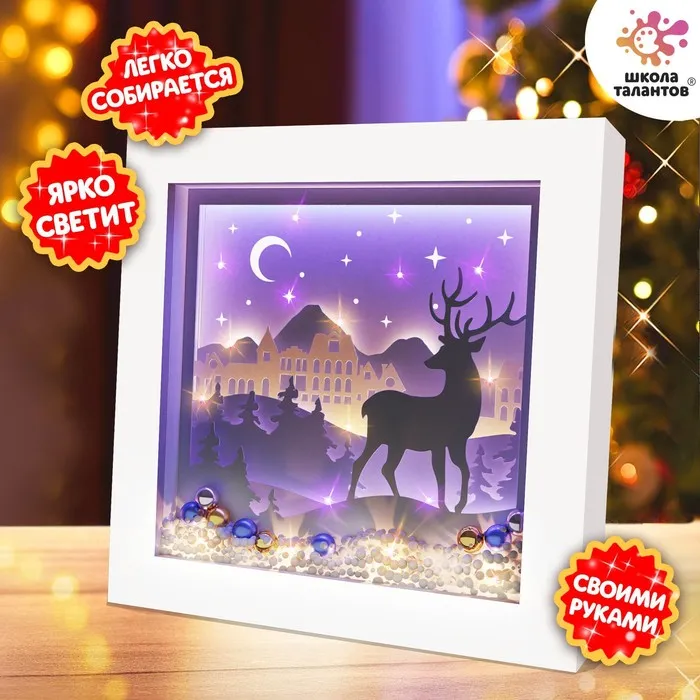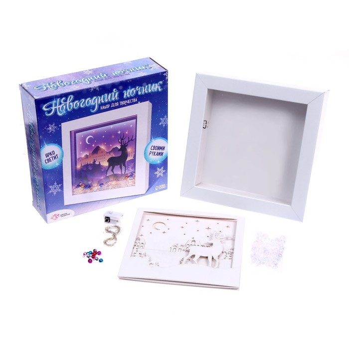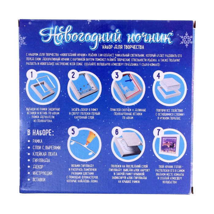 С таким набором для творчества ребёнок своими руками сделает уникальный ночник, который будет его радовать перед сном. Сборка ночника с картинкой внутри поможет развить творческие способности ребёнка. А ещё подарит радость и новогоднее настроение всей семье. Создайте волшебную атмосферу праздника!
