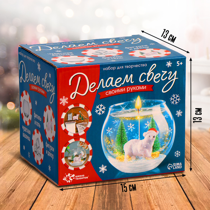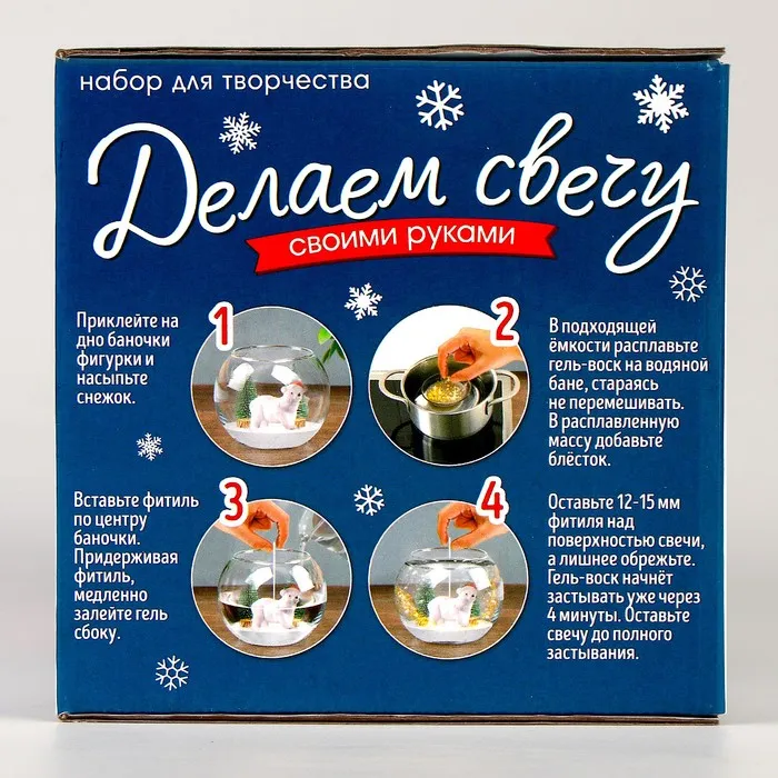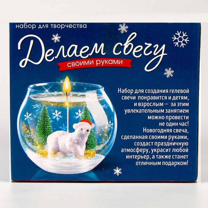 Вместе с малышом точно следуйте инструкции, и у вас получится прозрачная гелевая свеча. Блёстки и декор из набора помогут украсить изделие.