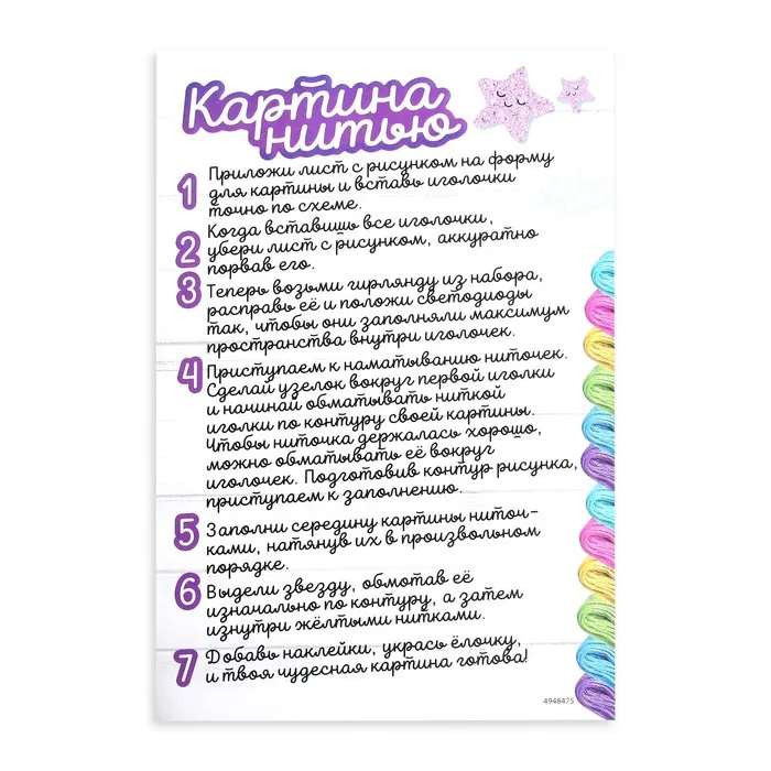В наборе представлен вариант техники стринг-арт для детей. Чтобы собрать всё точно, ребёнку обязательно потребуется помощь взрослого.