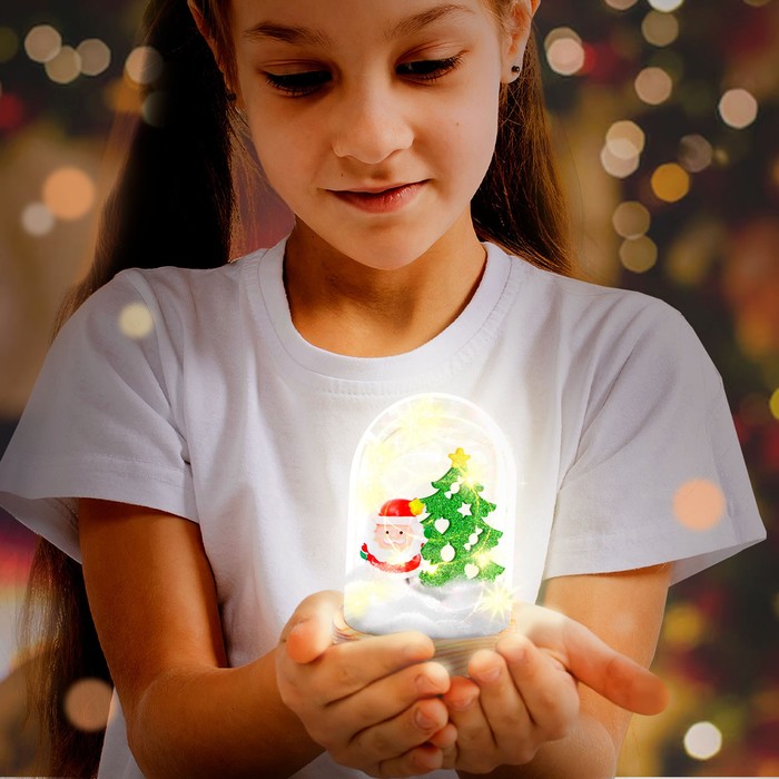 В наборе: деревянная основа-подставка, прозрачный купол, детали для фигурки, клей, блёстки, искусственный снег, светящаяся гирлянда.