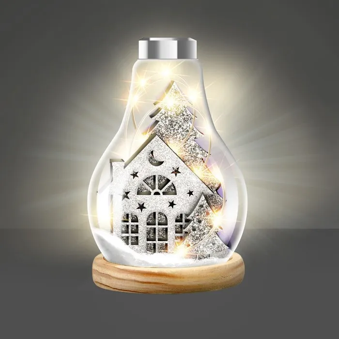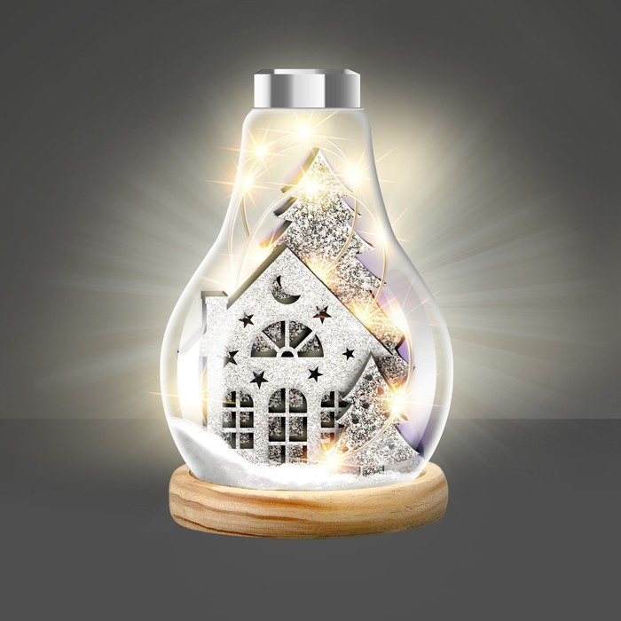 В наборе: основа, деревянная фигурка, клей, блёстки, декор, светящаяся гирлянда.