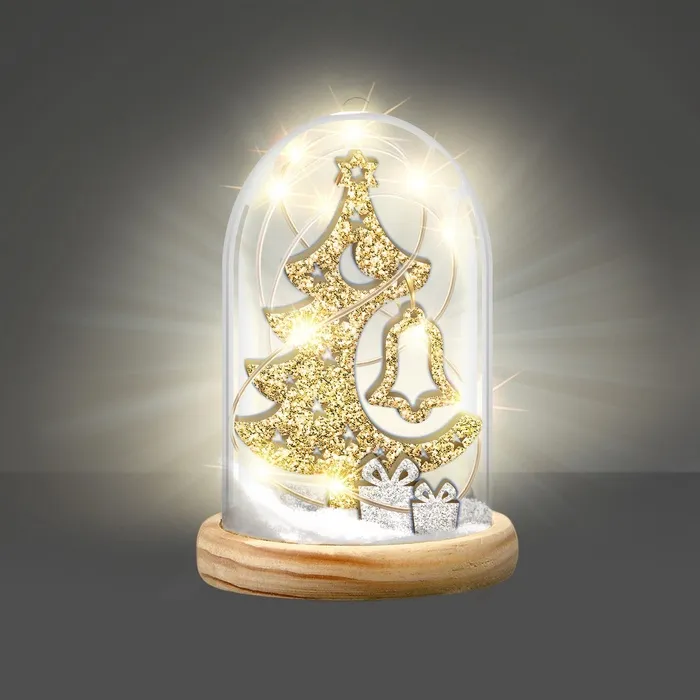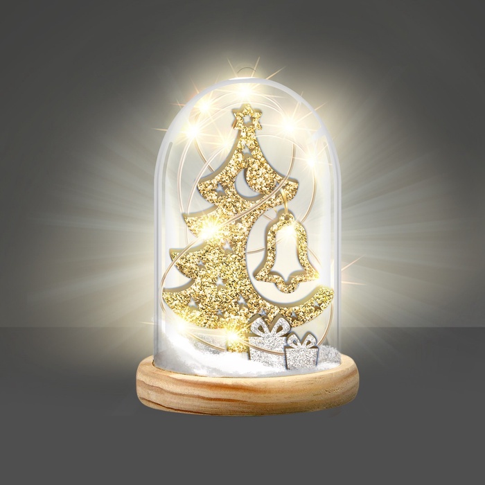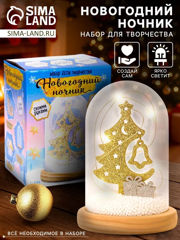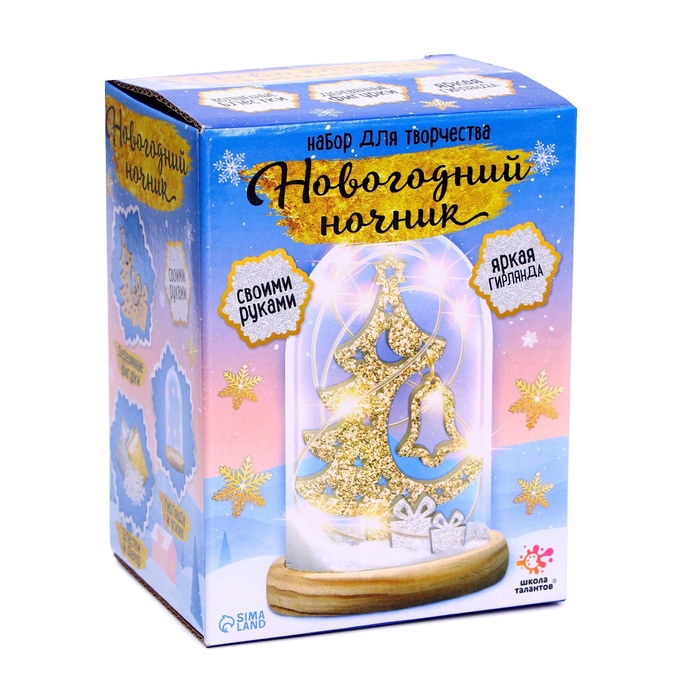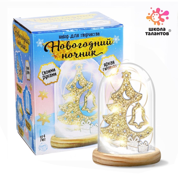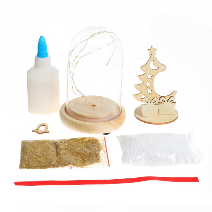 В наборе: деревянная основа-подставка, прозрачный купол, детали для фигурки, клей, блёстки, искусственный снег, светящаяся гирлянда.