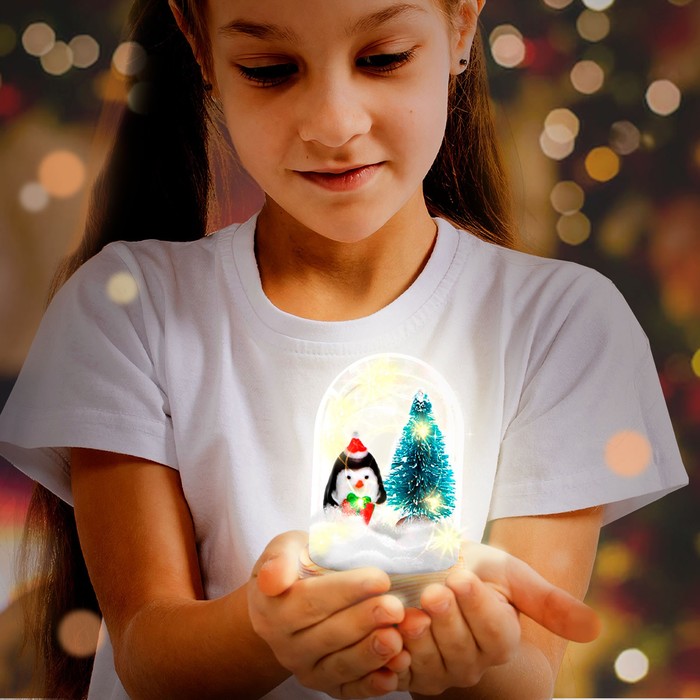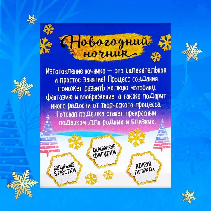 В наборе: деревянная основа-подставка, прозрачный купол, 2 фигурки, клей, блёстки, искусственный снег, светящаяся гирлянда.