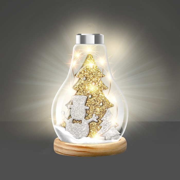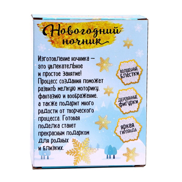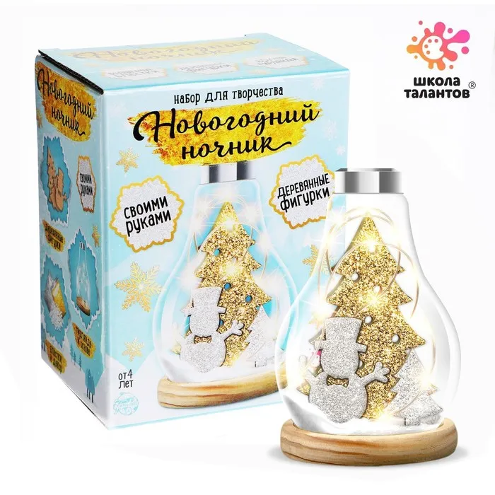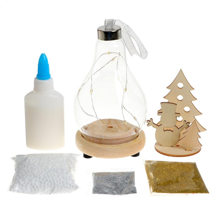 В наборе: основа, деревянная фигурка, клей, блёстки, декор, светящаяся гирлянда.