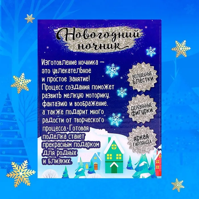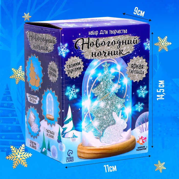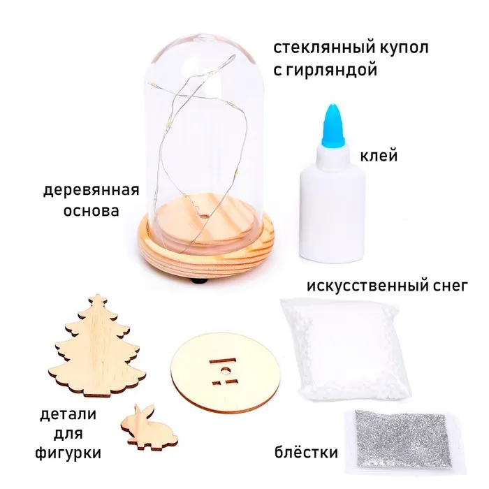 В наборе: деревянная основа-подставка, прозрачный купол, детали для фигурки, клей, блёстки, искусственный снег, светящаяся гирлянда.