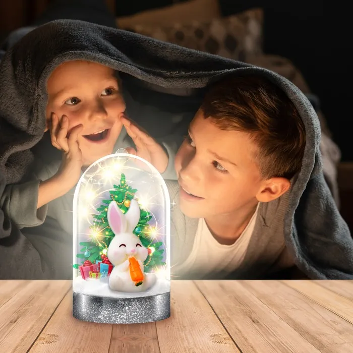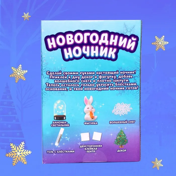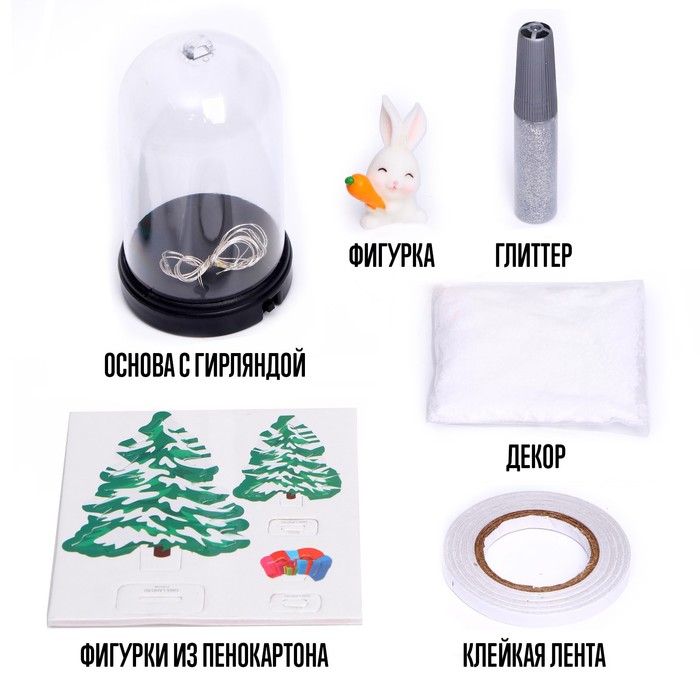 В наборе: баночка-светильник с гирляндой, декоративная фигурка, гель с блёстками, искусственный снег, двусторонняя клейкая лента, декор.