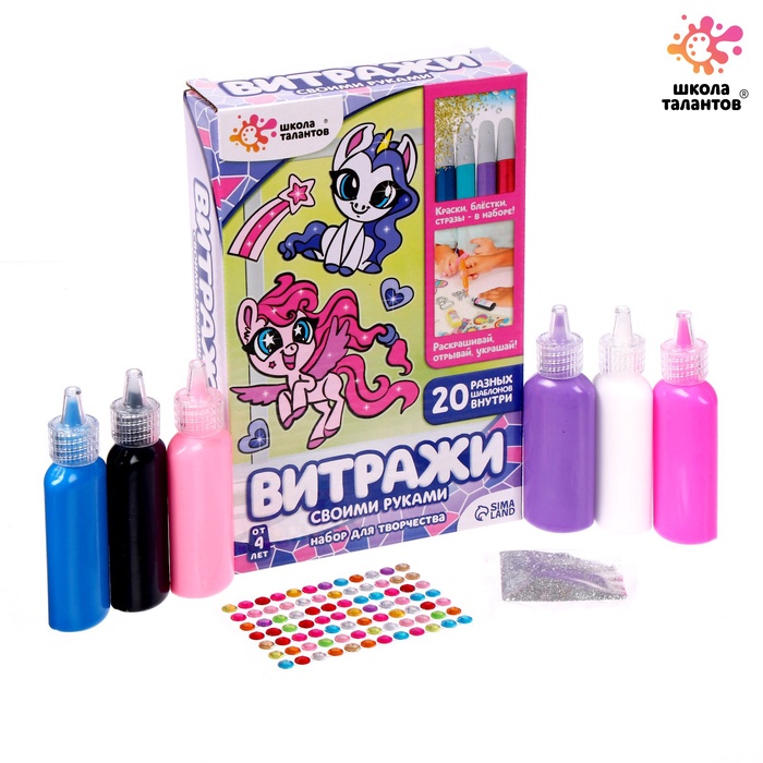 Набор для творчества «Раскрашиваем витражи. Пони» станет отличным выбором для увлекательного досуга детей. Этот комплект подарит малышу радость творчества и поможет создать яркие витражные украшения с изображениями волшебных единорогов. Благодаря простоте работы с набором, даже начинающий художник сможет добиться красивого результата.