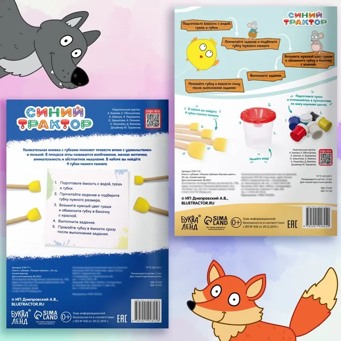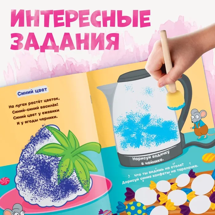 - В наборе есть всё необходимое: книги с заданиями и губки для рисования, что делает процесс творчества удобным и безопасным.