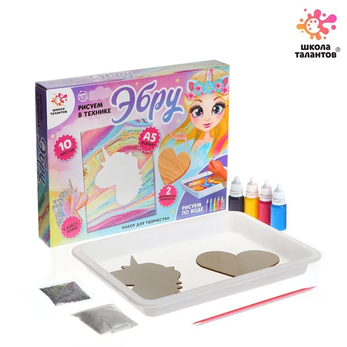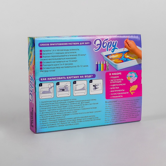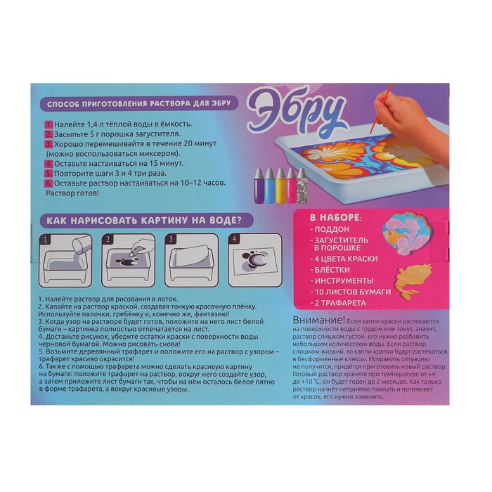 Эбру — техника рисования на поверхности воды с последующим переносом изображения на другую основу. Набор для творчества поможет вам познакомиться с этой удивительной техникой живописи, а также развить воображение, мелкую моторику и проявить творческие способности. Получившуюся картину можно перенести не только на бумагу, но и на ткань.