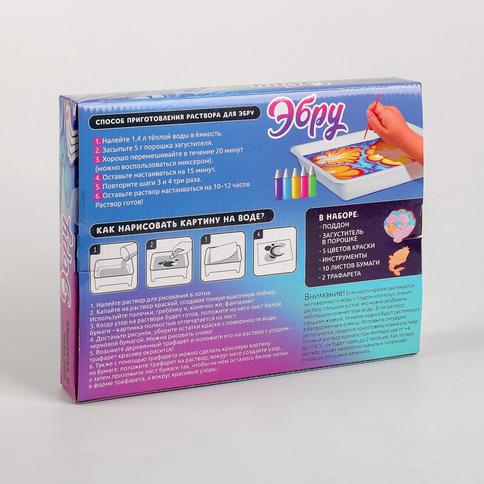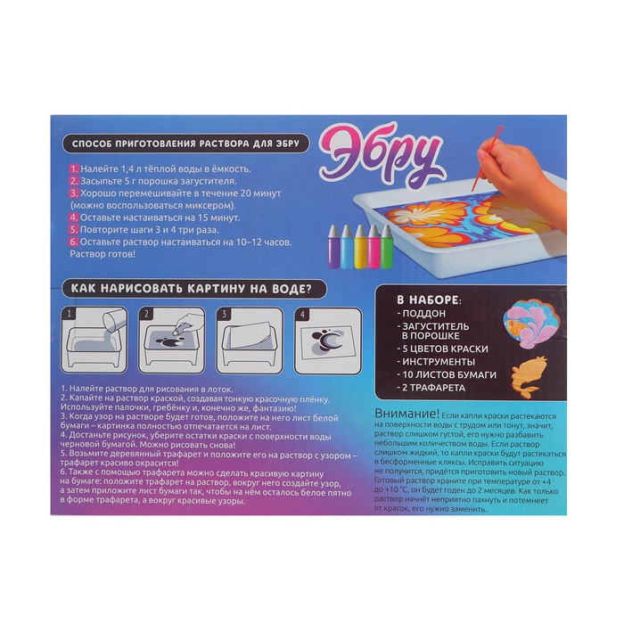 Эбру — техника рисования на поверхности воды с последующим переносом изображения на другую основу. Набор для творчества поможет вам познакомиться с этой удивительной техникой живописи, а также развить воображение, мелкую моторику и проявить творческие способности. Получившуюся картину можно перенести не только на бумагу, но и на ткань.