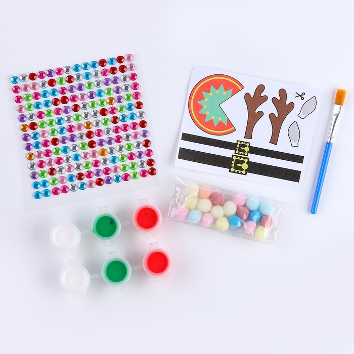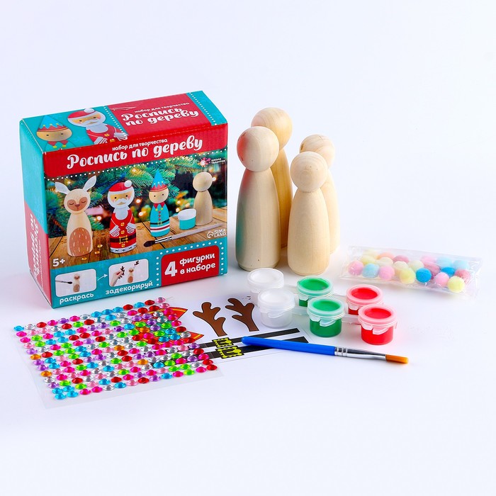 - В комплект входят 4 фигурки-основы, акриловые краски, кисть, помпошки, стразы и наклейки для декора.