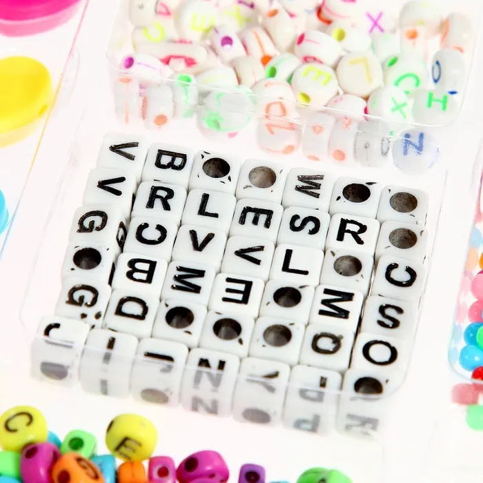 - В комплекте есть бусины с буквами, из которых можно составить надпись на браслете.