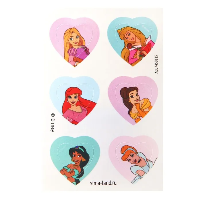 - Наклейки с принцессами из вселенной Дисней: Ариэль, Рапунцель, Аврора, Белль, Жасмин, Золушка.