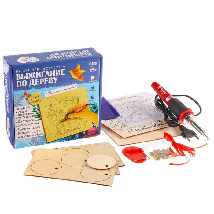 Комплект создан для тех ребятишек, кто ещё не научился самостоятельно придумывать сюжеты, но уже уверенно держит в руках прибор для выжигания. С его помощью малыш легко создаст настоящее произведение искусства на простом кусочке дерева.