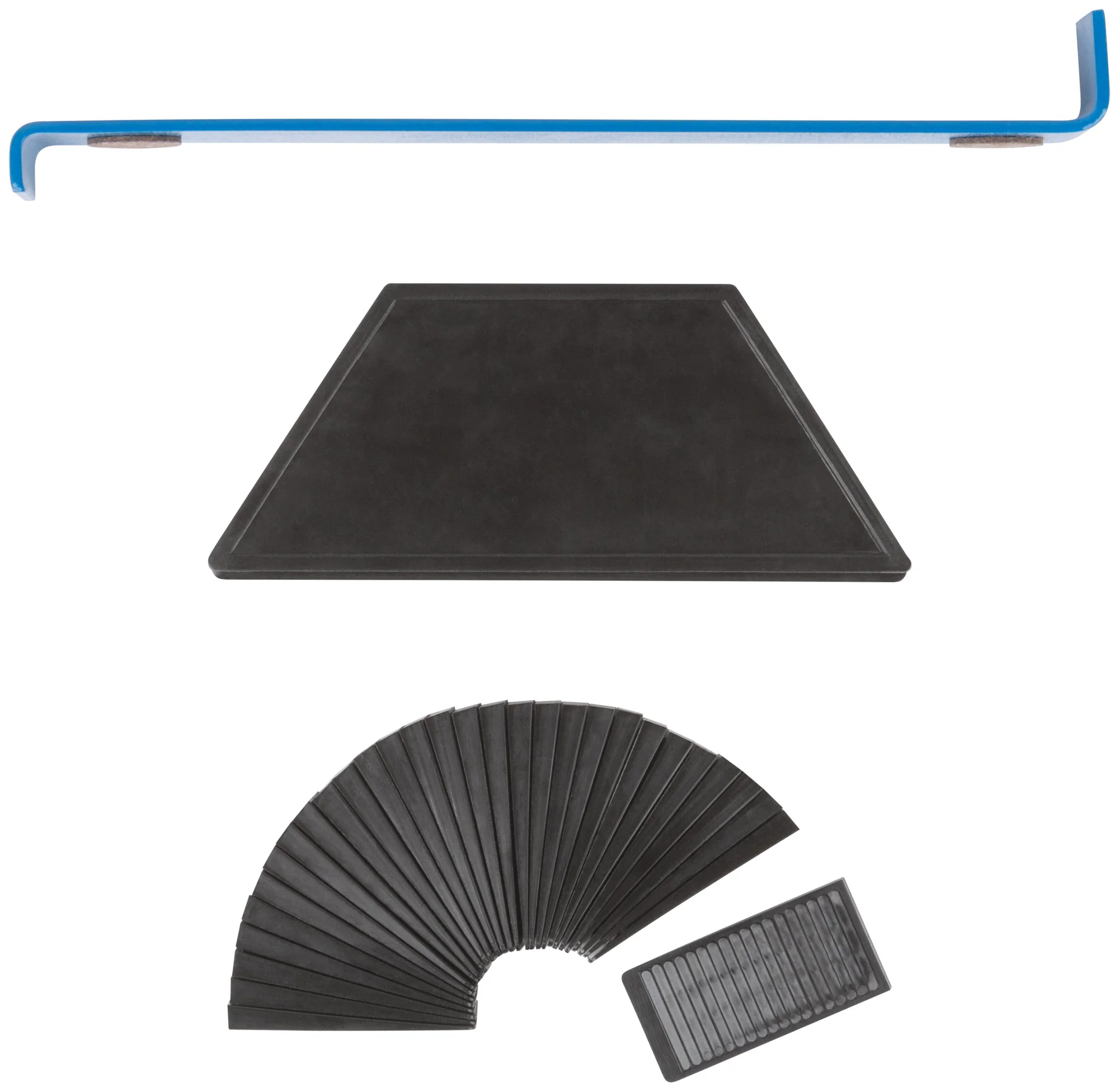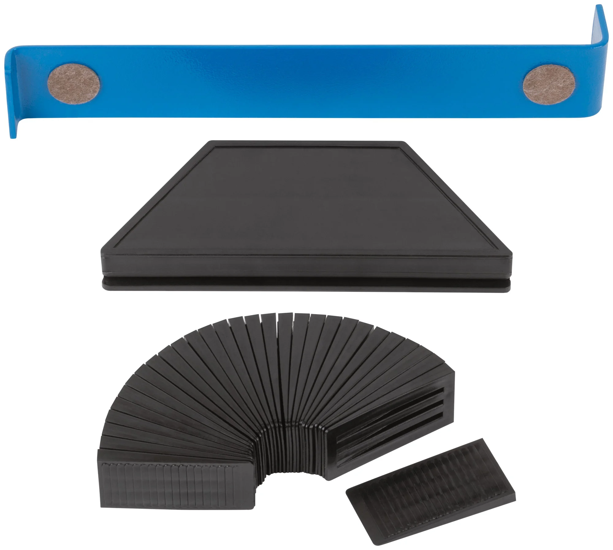Набор включает в себя пластиковый брусок, монтажную скобу и 30 пластиковых клиньев, что позволяет точно регулировать расстояние между ламинатными панелями и стеной. Все элементы выполнены из прочных материалов: инструментальной стали и пластика.