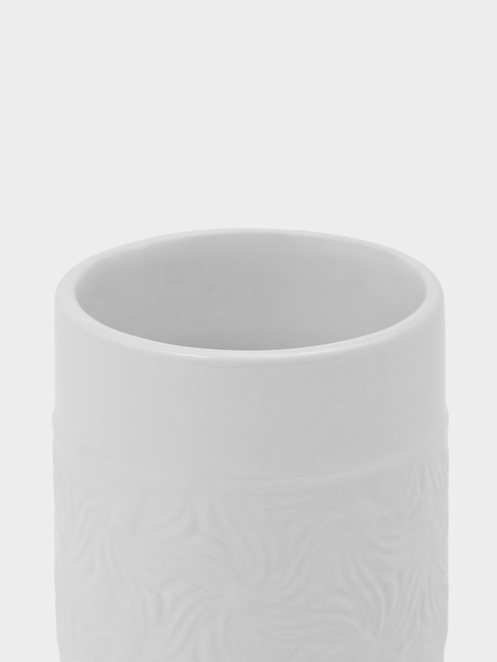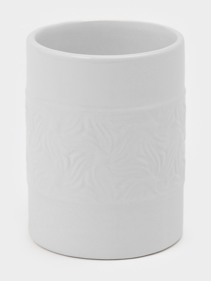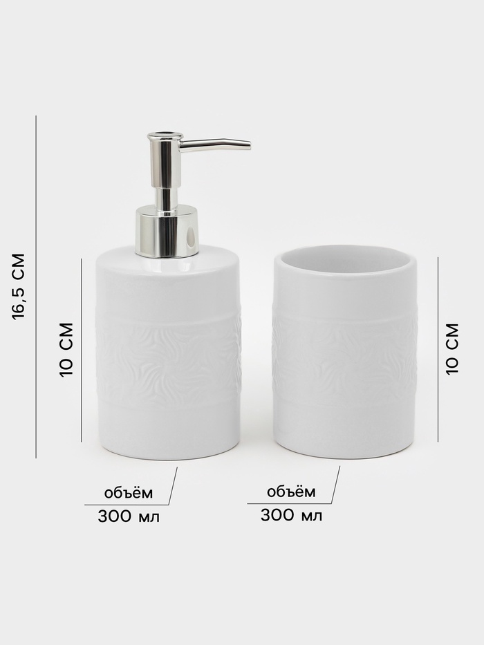Двухпредметный керамический набор для организации пространства у раковины. Лаконичный белый дозатор и стакан объединяют функциональность и эстетику, создавая на полочке в ванной ощущение порядка и чистоты.