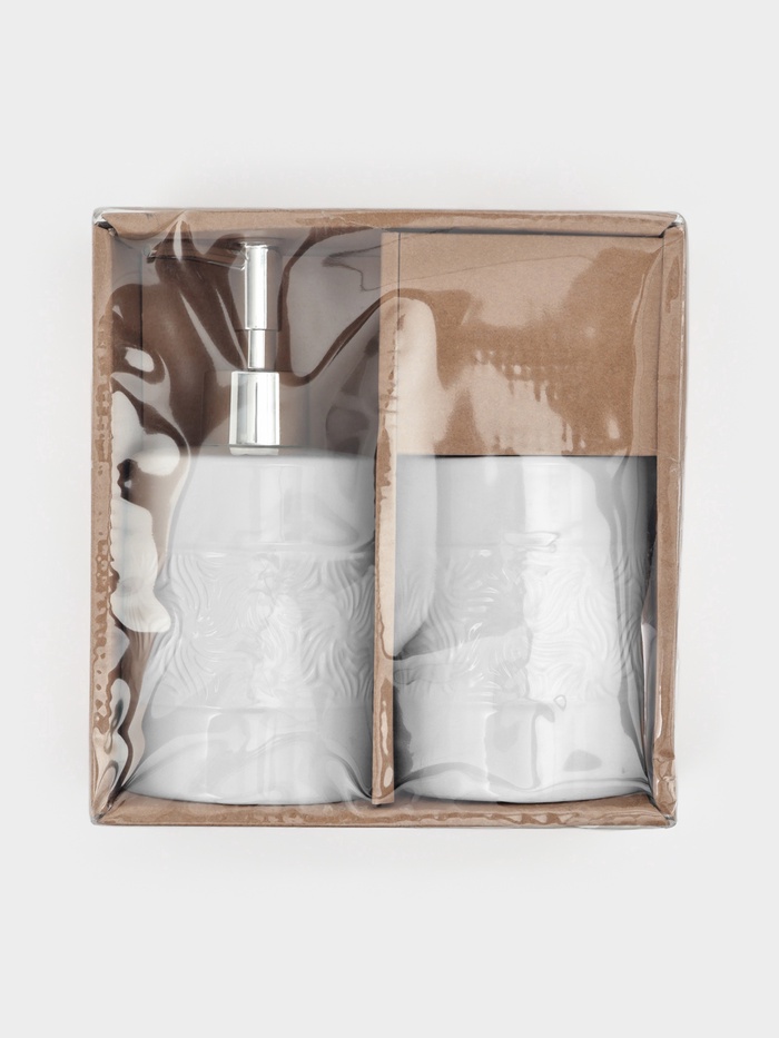 Этот набор выполняет простую, но важную работу: убирает с раковины лишние бутылочки и тюбики, возвращая пространству визуальную ясность. Тяжёлая керамика стоит устойчиво, а белый цвет не отвлекает внимание. Это выбор для тех, кто устал от пластикового разнообразия и хочет, чтобы даже бытовые мелочи выглядели цельно и спокойно. Поставьте его один раз — и каждое утро вы будете начинать с аккуратной, организованной поверхности.