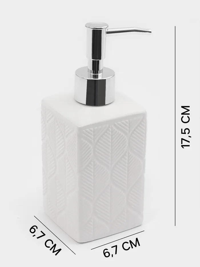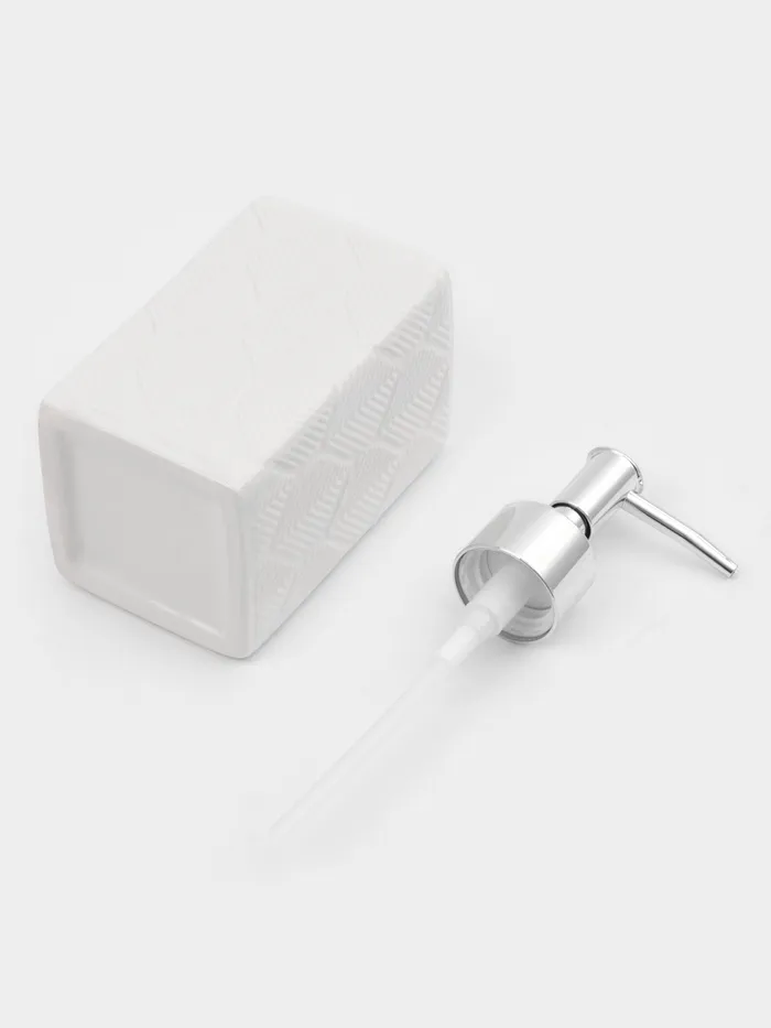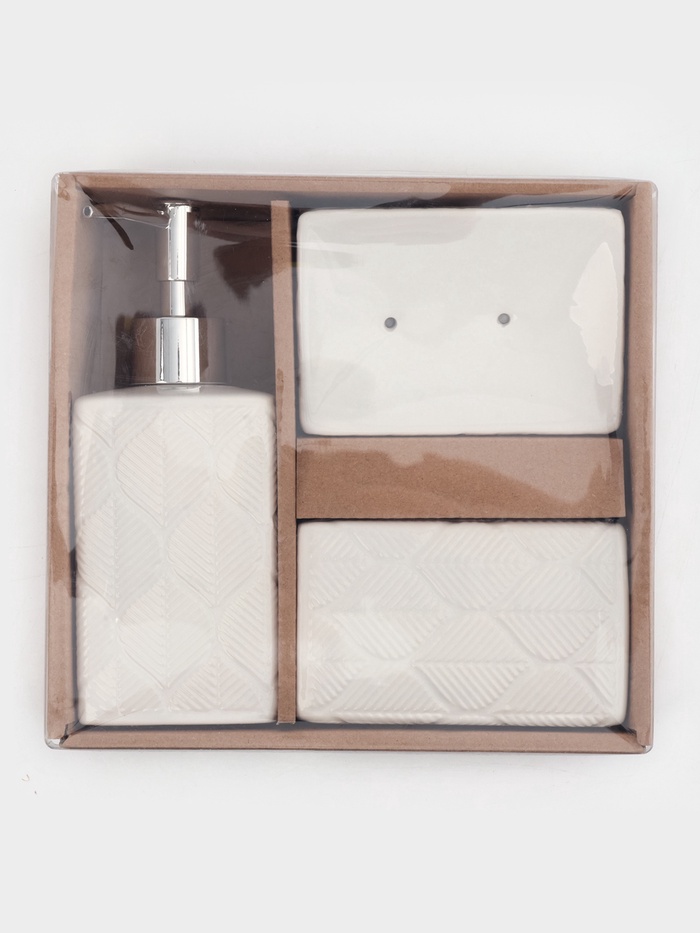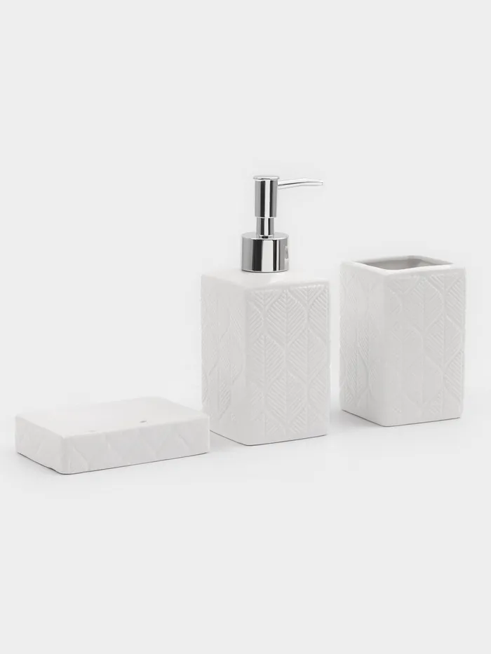 Элегантный набор для ванной «Лепесток» из 3 предметов: дозатора для мыла, стакана и мыльницы. Изготовлен из качественной керамики в классическом белом цвете с нежным растительным орнаментом. Комплект создаст атмосферу уюта и завершённости в вашей ванной комнате.