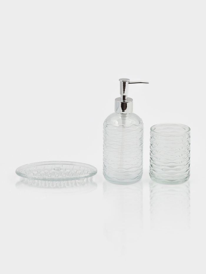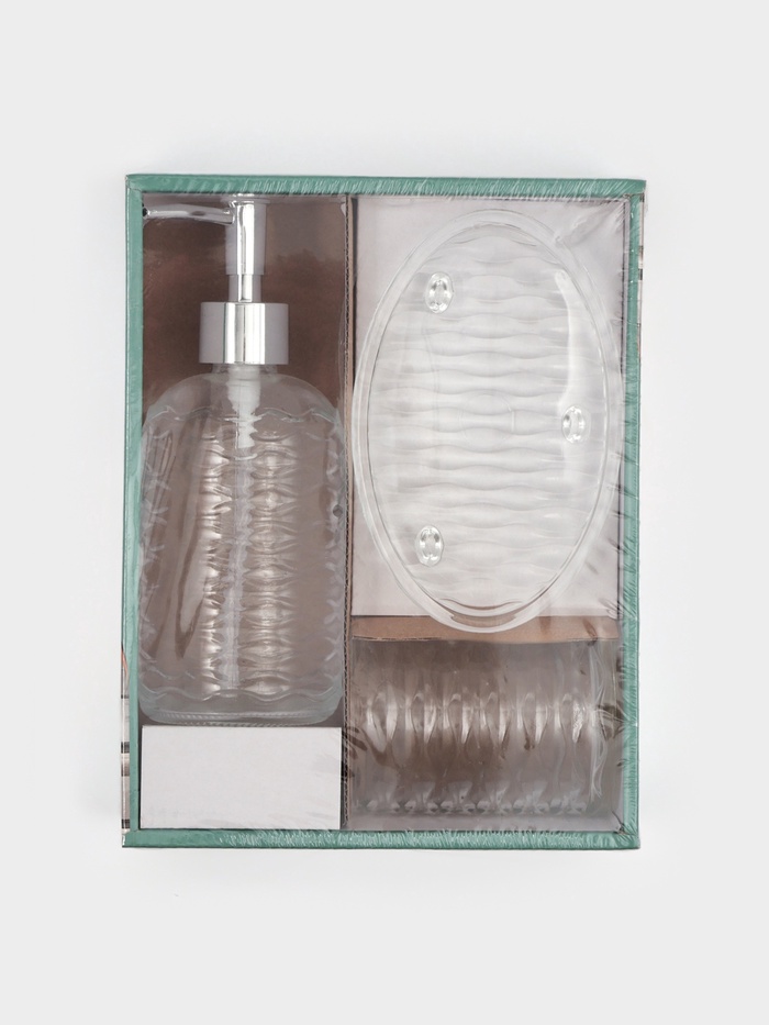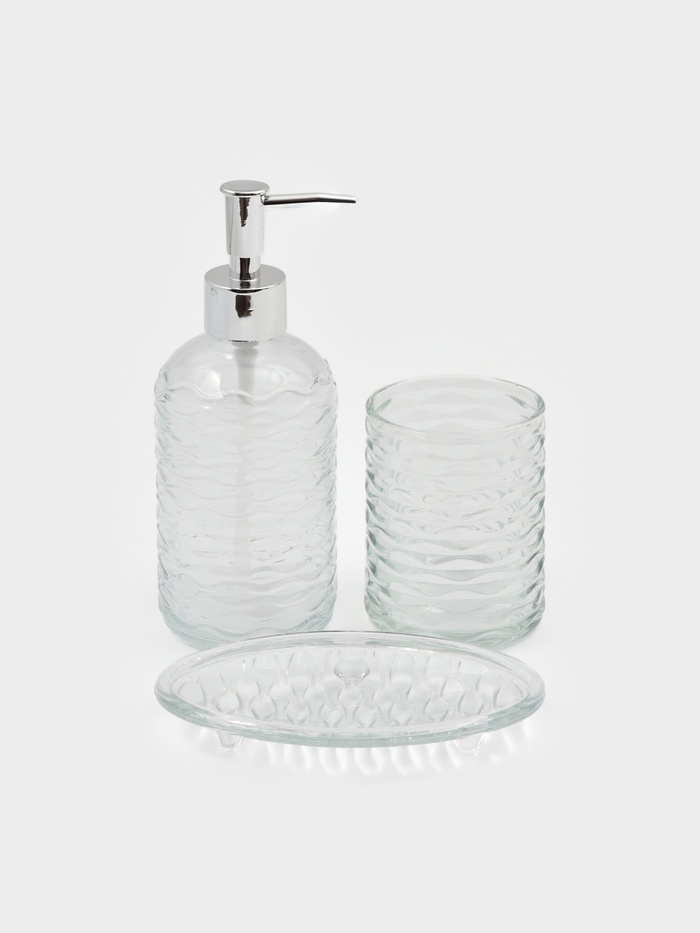 Этот набор не заявляет о себе — он работает. Прозрачное стекло не создаёт визуального шума и не требует идеального порядка, чтобы выглядеть уместно. «Чистота — это когда всё на месте, но ничего не бросается в глаза»: дозатор, стакан и мыльница становятся частью интерьера, а не его временным дополнением. Лёгкость ухода и долговечность материала избавляют от необходимости часто менять аксессуары.