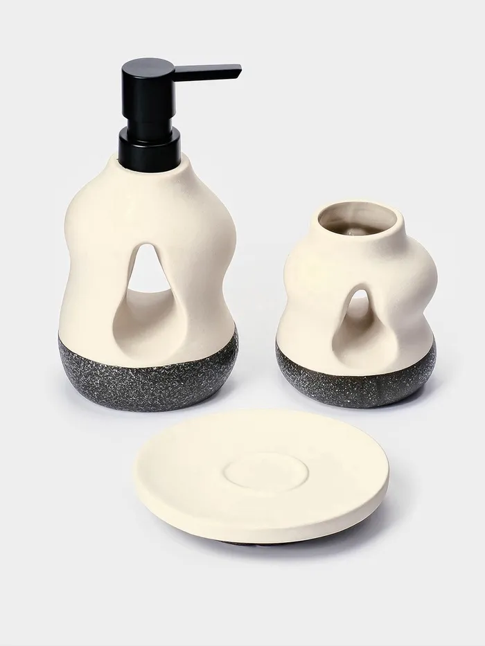 Каждый предмет набора изготовлен из высококачественной керамики, что гарантирует долговечность и устойчивость к воздействию влаги. Простота и лаконичность дизайна подчеркивают современный подход к оформлению пространства, делая его универсальным для различных стилей.
