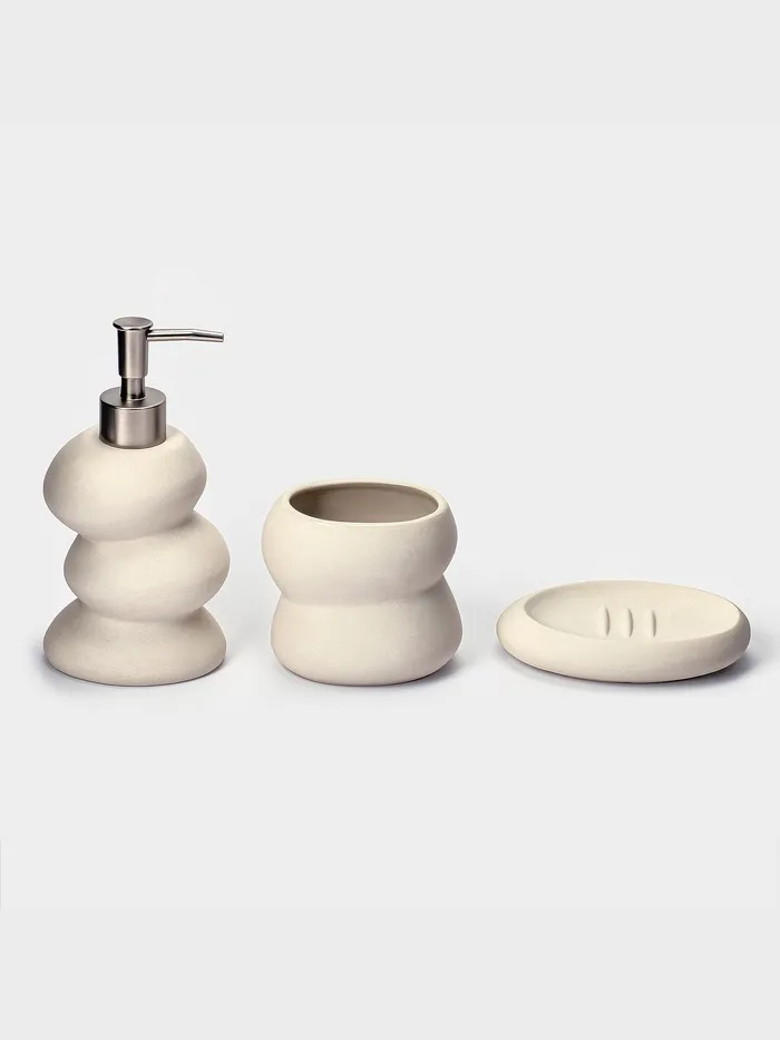Набор для ванной из трёх предметов в бежевом цвете станет стильным и функциональным дополнением интерьера. Комплект включает всё необходимое для поддержания порядка и уюта в ванной комнате. Изделия из керамики подчеркнут эстетику пространства, сохраняя лаконичный и современный вид.