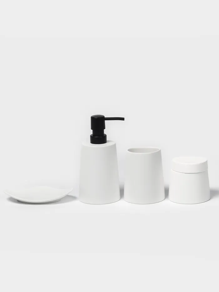 Набор для ванной из керамики в белом цвете станет стильным и функциональным дополнением интерьера. Комплект из четырёх предметов включает всё необходимое для поддержания порядка и эстетики в ванной комнате. Минималистичный дизайн без лишних деталей подчеркнёт современный стиль и легко впишется в любую обстановку.